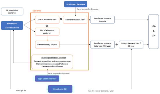 In order to accomplish the intended goals, first, a BIM model representing the case study was created in Autodesk Revit. The model was then characterized with all the construction solutions under analysis to achieve a total of 18 different envelope scenarios for the building. Next, Dynamo was used to introduce new shared parameters to the building elements (external walls, roofs, and floors) regarding their life cycle costs. An Excel import function was used to upload a spreadsheet with all the elements costs (acquisition, construction, maintenance, and demolition) from Cype Cost Generator. Simultaneously, Dynamo was also used to automatically extract the elements area (Bill of Quantities) through schedules. Then, each scenario cost was assessed by multiplying the elements area per the element’s costs imported from Excel. The Bill of Quantities was also used to achieve each scenario’s total life cycle impacts. A similar procedure to cost was used, by uploading to Dynamo an Excel spreadsheet with the elements life cycle impacts to be multiplied by the elements BoQ. Elements impacts were based on a local database [37] and grouped in an Excel spreadsheet. Note that in both uploaded Excel spreadsheets, the elements impact and cost must be associated with a same-identity material in Autodesk Revit. Otherwise, Dynamo would not be able to link the uploaded impacts and costs with the respective BIM model element. The developed Dynamo routine is presented in Figure A1.