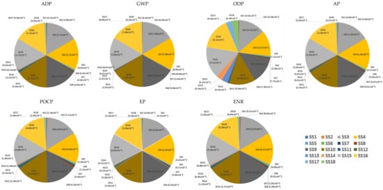 Overall, with the LCA analysis, it was possible to quickly identify a total of 10 high-impact scenarios: SS3, SS4, SS9, SS9, SS10, SS13, SS14, SS15, SS16, SS17 and SS18. Moreover, SS9 had the worst performance in ADP, AP, POCP and ENR, SS10 in GWP and EP, and SS15 in ODP.