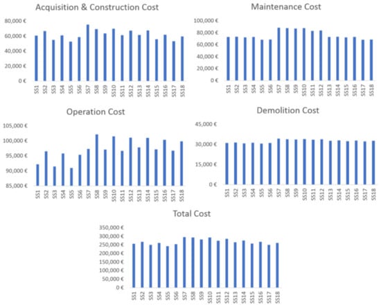 When analyzing the results of variation per life cycle stage (Figure 4), all the considered scenarios had an acquisition/construction cost between 21% and 25% of the total life cycle cost. The maintenance cost ranged between 26% and 30%, while the operation cost ranged between 33% and 39%. The demolition cost was identical for all the scenarios, representing 12% to 13% of the building life cycle cost. When concerning to the analysis per life cycle stage (Figure 5), SS5 had the lower cost during the construction, demolition, and operation phases and SS17 during the maintenance stage. Globally, the first six scenarios (SS1, SS2, SS3, SS4, SS5 and SS6) were usually cheaper in all the building life cycle stages, as they present less mass and material. On the other hand, the higher costs during the construction, maintenance, and demolition life cycle stages belong to SS7, while SS8 had the highest operational cost. Moreover, all the simulation scenarios with EW2 (SS7, SS8, SS9, SS10, SS11 and SS12) had higher maintenance and demolition costs. This result was somehow expected, as it is more expensive to maintain and demolish concrete than masonry walls. Finally, all scenarios with element F2 (SS2, SS4, SS6, SS8, SS10, SS12, SS14, SS16 and SS18) had significantly higher costs during the operation stage when compared with the remaining scenarios. This fact is justified due to element F2 being less thick as compared to element F1, resulting in a reduced thermal resistance.