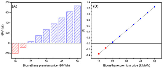 - Scenario 3: the last scenario considered in this work includes both the effect of biomethane incentives offered by the government and the sale of CO2. Furthermore, a comparison between the biomethane incentives needed to make the project profitable with and without selling the CO2 was carried out.