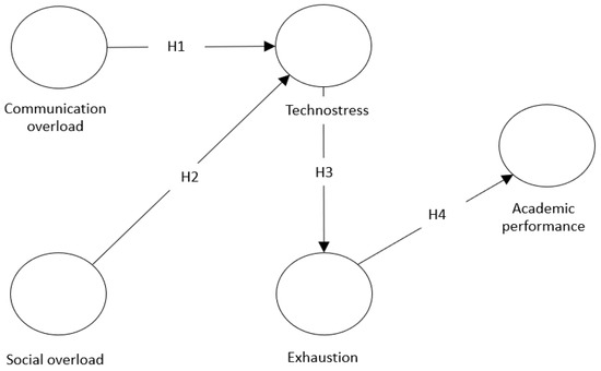 It is hypothesized that communication overload and social overload lead to technostress [59,60,61,62], which causes exhaustion and negatively influences academic performance [59,63,64]. The following hypotheses are proposed to describe the complete path to connect the variables: