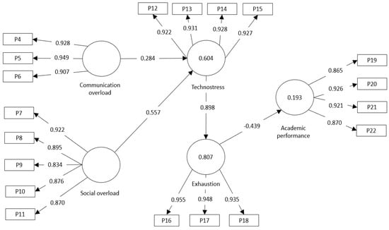 Figure 2 shows the evaluation of the research model. It can be observed that communication overload and social overload positively influence technostress. Simultaneously, it was shown that technostress positively influences exhaustion. Finally, exhaustion has a negative influence on students’ academic performance.