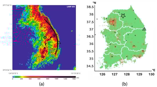 (a) LAMP WRF d03 domain and terrain heights, and (b) PM observation stations with provincial boundaries (white solid line) used in the analysis. Black solid line, Taebaek Mountains; black dashed line, Sobaek Mountains; black star, Chuncheon; black triangle, Uljin; +, KMA station; and red circle, AirKorea station.
