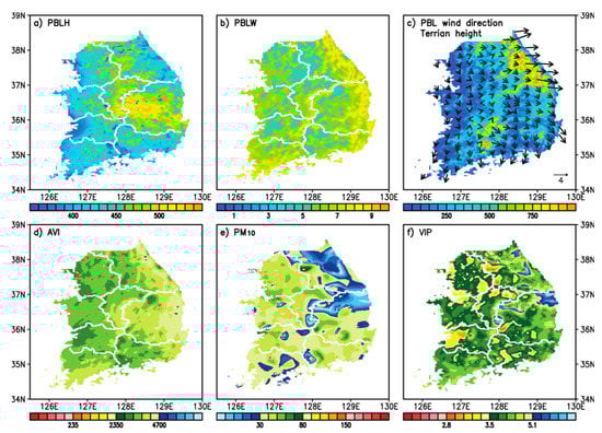 This study analyzed the AVI, PBLH, PBLW, and PM10 concentrations values of three cities in South Korea as they are closely related to the quality of life for people. In particular, regional, seasonal, and diurnal variations were examined based on the dataset of a high-resolution numerical grid model and PM10 observations. Based on this data, a new index (VIP) was created by combining the AVI, which describes the general dispersion capacity during all stability conditions within the PBL and high-resolution PM10 data. Using this index, the ventilation conditions and PM10 concentrations of South Korea were spatiotemporally examined.