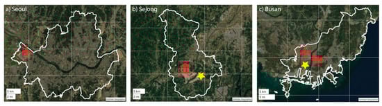 As the AVI and PM10 concentrations have significant regional differences, local spatiotemporal analysis were conducted for three cities in South Korea. Among the selected cities, Seoul, which is located in the northwestern part of South Korea, has the highest population density and is the most active region. It is characterized by mountains toward the north and south and the Han River flowing through its center (Figure 4a). Meanwhile, Sejong is an administrative city, located in a central inland area, and is preparing to be transformed into a smart city. Its residential area and central administrative agencies are located on flat lands, to the south of Sejong. There is a river flowing through this area, and a smart city is being planned nearby (Figure 4b). Finally, Busan, often referred to as the second capital, is located on the southeastern coast of South Korea and comprises a mountainous terrain. A river flows from the north to the south in the western area of Busan, and there is an industrial complex on the eastern bank of the river. Further, a smart city is being planned along the western part of Busan (Figure 4c).