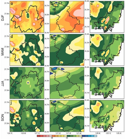 Figure 5 shows the VIP variability in each region according to the seasonal VIP patterns of Seoul, Sejong, and Busan. It can be seen that high VIP values appear at high altitudes in mountainous areas and low VIP values occur near rivers that form valleys with low altitudes. The airport to the west of Seoul exhibits very low VIP values throughout the year (Figure 4a and Figure 5, left). Similarly, the airport area in Busan exhibits low and moderate VIP values throughout the year, and the area with factories shows a similar pattern (Figure 5, right). In general, areas near the airport have high AVI values owing to the strong PBLW. However, the modeled PBLH is low because the effects of airport tarmac were not implemented in the model. Consequently, it exhibits a low VIP value and a high PM10 concentration owing to airplane operation. Compared with Sejong and Busan, Seoul exhibits a more complex spatial distribution owing to its high urbanization, revealing a relatively high VIP value because of its high altitude mountainous area. The patterns of Sejong show that the VIP is dense at night in the east–west direction along the flat terrain, as shown in Figure 4 (Figure 5, middle). The maps shown in Figure 5 can help establish an urban plan or aid the construction of residential complexes in areas with low emission concentrations within these cities. Furthermore, other areas in the country may use these analysis maps as a reference for their own planning.