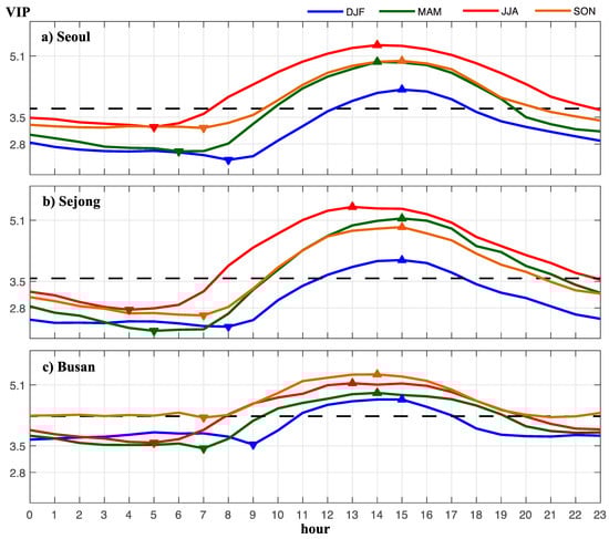 Seasonal variations in the diurnal cycle of VIP in (a) Seoul, (b) Sejong, and (c) Busan (blue, winter; green, spring; red, summer; brown, autumn; black dashed, annual mean; ▲, maximum; and ▼, minimum).