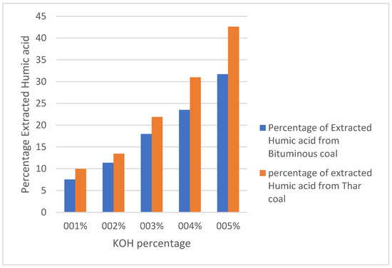 Gravimetric determination of humic acid extracted from lignite and bituminous coal using different KOH percentages.