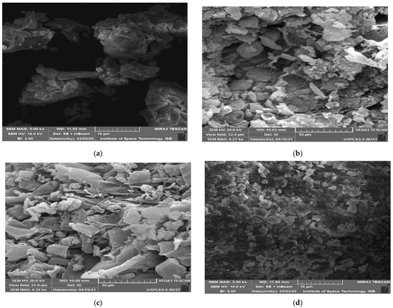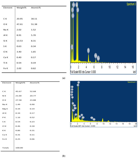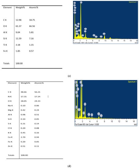 Similarly, Figure 6c,d indicates the humic acid produced from raw bituminous coal and HNO3 treated bituminous coal. The elemental composition, as shown in Figure 7c, indicated the presence of major elements such as carbon, oxygen, and silicon. The presence of nitrogen in treated bituminous coal with HNO3 indicated the incorporation of nitrogen-containing compounds such as -NO2. This showed that treatment of bituminous coal with nitric acid results in the breakdown of the toughest aromatic bonds and aliphatic side chains present in the structure of coal. That is why the produced humic acid also indicated the presence of nitrogen on the surface by elemental analysis, shown in Figure 7d. Some other elements also seemed to be present, such as Na, Mg, S, Ca, K, and chlorine. The acidic pretreatment destroyed the hydrogen bonds and Van der Waals forces as well as π-π bonds proposed by Piccolo [14] and coworkers. One of the studies conducted by Chu-fang et al. [34] reported the introduction of chlorine and dislodging of Al and Ca ions by treating coal with acid and producing humic acid from it. Some of the crystal or needle-like structures were also shown on humic acid produced from HNO3 treated bituminous coal, which clearly indicated that some new structures have been produced. Another study conducted by Stefane et al. [16] had shown the SEM images of produced humic acid from lignite coal at different magnifications. They also reported the presence of weak Van der Waals forces, hydrogen bonds, and the presence of porous structure on the surface of humic acid.