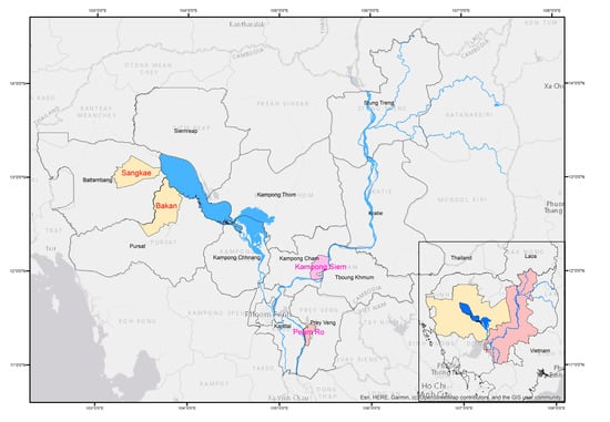 Primary data was collected via household surveys, along with key informant interviews and group discussions conducted as part of the fieldwork conducted between May 2019 and March 2020. Four districts representative of the overall conditions in each target province were selected for these research activities, based on their level of dependence on water resources for rice paddy cultivation and vulnerability to the impacts of climate change. The selection was informed by discussions with local stakeholders such as government officers and NGO representatives from the four provinces. This provided an opportunity to compare the impacts of climate change across different rice-producing regions. Bakan and Sangke districts in Pursat and Battambang province, respectively, were chosen to represent the Tonle Sap Region, while Peam Ro and Kompong Siem districts in Prey Veng Kompong Cham Provinces, respectively, were chosen to represent the Mekong River region (Figure 1).