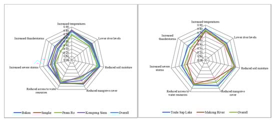The survey data were analyzed using Weight Average Index (WAI), t-tests, ANOVA, and logistic regression. WAI measuring on a five-point scale was used to draw local perceptions regarding climatic change and the interaction of vulnerability factors incurred by flood and droughts. The five-point scale included: considerably less (CL) = 0.00–0.20, less (L) = 0.21–0.40, moderate (M) = 0.41–0.60, high (H) = 0.61–0.80, and very high (VH) = 0.81–1.00. While the T-test was used to compare mean values of vulnerability factors across the Tonle Sap and the Mekong River regions, ANOVA was applied to compare the mean values within the four study districts. Attributes used for analysis, t-test and ANOVA included increasing temperatures, reduced availability of water resources, decreasing soil moisture, decreasing mangrove cover and river levels, and an increased occurrence of windstorms and lightning. Simultaneous Multiple Regression was used to predict whether these values were significant with respect to climate impacts related to flood and drought events. The key informant discussions were used to elaborate on the information obtained about various physical, economic, social, and environmental vulnerability factors, which were analyzed with respect to the survey data during the focus groups involving local experts.