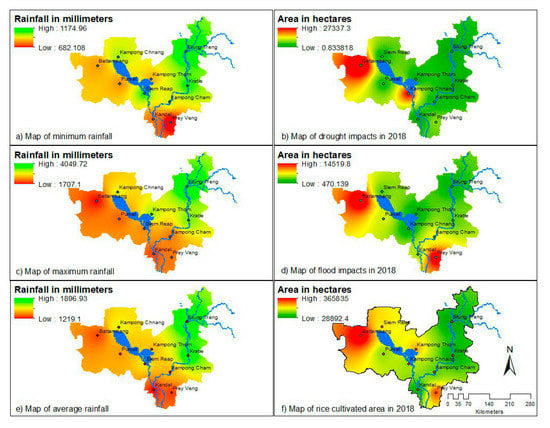 Following the interviews, focus group discussions comprising 10 participants were held with rice farmers and the commune heads of each district. The meetings were used to discuss problems that had arisen due to climate change impacts. A meeting of local experts in the fields of physical and human geography, environmental and social sciences, and development studies, also comprising 10 participants was conducted to access a local analysis of the survey data. A full list of interviewees and focus-group discussions is attached in Appendix A. The researchers also participated in various regional conferences to gain insights into the impact of climate change on rice production across the region including the 8th Regional Stakeholder Forum held in Bangkok, Thailand (5–6 November 2019), and the 9th Regional Stakeholder Forum held in Lang Prabang, Lao PDR (5–6 February 2020).The Standardized Precipitation Index (SPI) applied as part of this study was used to compare the probability of precipitation across different time scales in the region using precipitation data accessed from MoWRaM. By definition, the Standardized Precipitation Index (SPI) is a measurement of rainfall intensity for a certain time scale such as 1, 2, or more months. It was introduced by McKee McKee, Doesken, and Kleist (1993) [83] based on the probability distribution illustrated by Thom (1966) [84]. Climate vulnerability maps were developed using annual rainfall data and provincial statistics on the area of crops damaged by flood and drought accessed from MAFF. The rainfall gradient displayed on the maps was determined using the Inverse Distance Weight method.