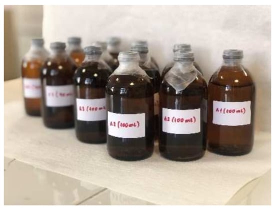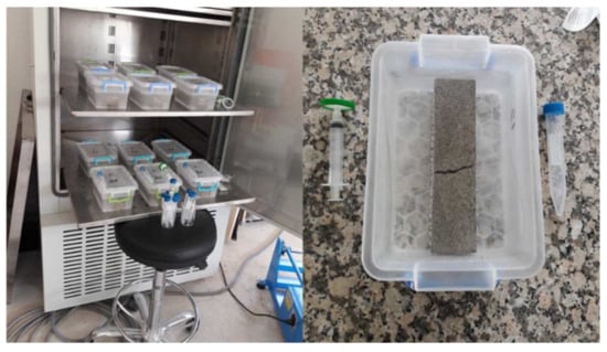In all experiments, 100 mL (107 mL full volume) serum bottles with rubber stoppers were used (Figure 2). Tap water pH was adjusted to 9.8 by using NaOH (2 M) to mimic the pH value in cracked concrete []. Test bottles, stoppers and tap water were sterilized by autoclaving at 1 bar and 121 °C for 20 min. The spore content of each batch was set to 0.5 g CDW/L. Biogranules with identical particle size distribution were used in MICP tests. In each batch, 50% w/w of the biogranules were 1.00–2.00 mm in size, 0.35% w/w of biogranules were 0.85–1.00 mm in size and 15% w/w of the biogranules were 0.50–0.85 mm in size. The given size distribution was based on our previous study []. Batch reactors containing biogranules were filled with tap water and sealed with rubber stoppers. Each batch was prepared in triplicates. The initial contact of tap water with biogranules was considered as the beginning of the experimental period (t = 0 h) and the reactors were sampled and spiked every two days to replicate the previously defined nutrient leaching trends of various mortar specimens. Throughout the 16 days of experimental period, batch reactors were kept at 20 °C. On Day 16, final samples were taken, and the reactor content was further used for quantification of the precipitated CaCO3 amount.
