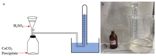 In order to quantify the amount of CaCO3 precipitated in the batch reactors, CaCO3 precipitates were dissolved with strong acid and quantification was made by measuring the amount of CO2 gas formed due the reaction. In order to achieve rapid and complete dissolution of precipitated CaCO3 minerals, 5 M H2SO4 was used. The addition of the strong acid dissolved CaCO3 minerals and led to production of CO2 which could be collected in a water column (Figure 3). By using the displacement of the water level in the column, ideal gas law and Henry’s constant, the CO2 generated from dissolution of CaCO3 was determined. By using the measured CO2, the amount of CaCO3 was calculated (Equations (2)–(4)).