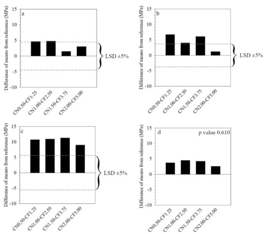 Difference of the mean compressive strength values of tested mixtures from reference specimen after curing at 20 °C and RH > 90% for (a) 3 days; (b) 7 days; (c) 28 days; (d) 56 days. LSD (3 days) = 4.5 MPa, LSD (7 days) = 3.8 MPa, LSD (28 days) = 5.6 MPa, LSD (56 days) = NA as p = 0.610. Reference strength values on 3, 7, 28 and 56 days were 36 ± 2 MPa, 42 ± 2 MPa, 48 ± 3 MPa and 60 ± 2 MPa, respectively.