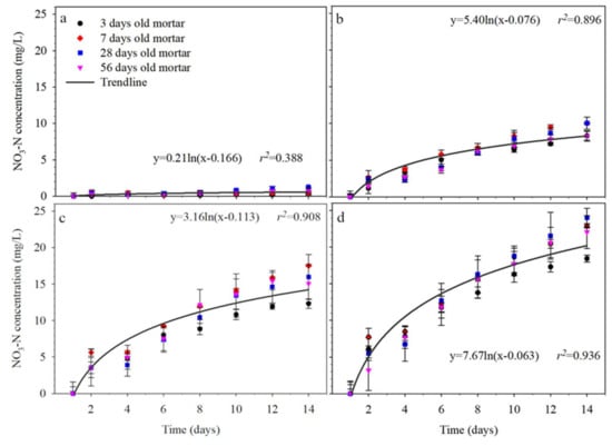 The changes of the NO3-N and HCOO− concentrations in the water were determined by regular sampling of the solution for 14 days. Observed changes in concentration in the first 24 h of the immersion period were due to the nutrients present on the surface of the specimens, so they were not considered whilst defining the nutrient leaching trend.