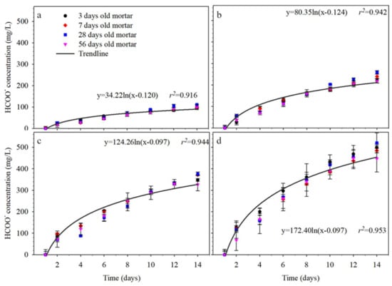 Nutrient leaching rates through the crack increased with the increasing initial nutrient content of the mortar specimens. Accordingly, the lowest bioavailable NO3-N (0.4 ± 0.1 mg/L) was observed in the batch containing the lowest initial nutrient content (CN0.50-CF1.25). In this batch, there was a minor increase in the nutrient concentration throughout the experimental period of 14 days (Figure 5). The highest bioavailable NO3-N (24.0 ± 1.3 mg/L) was observed in the batch containing the highest initial nutrient content (CN2.00-CF5.00). The average NO3-N leaching rates from the cracks of mortar specimens were found as 0.04 mg·d−1, 0.57 mg·d−1, 0.92 mg·d−1 and 1.32 mg·d−1 for CN0.50-CF1.25, CN1.00-CF2.50, CN1.50-CF3.75 and CN2.00-CF5.00, respectively (Figure 5). Formate leaching rates also increased with the increasing nutrient content of the mortar mix. Average HCOO− leaching rates from the cracks of different specimens were noted as 5.84 mg·d−1, 13.68 mg·d−1, 20.96 mg·d−1 and 28.64 mg·d−1 for CN0.50-CF1.25, CN1.00-CF2.50, CN1.50-CF3.75 and CN2.00-CF5.00, respectively (Figure 6).