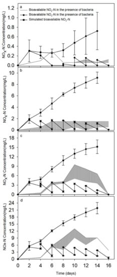 Evolution of bioavailable NOx-N in the presence of nitrate reducing biogranules under replicated bioavailable nutrient conditions of cracked (a) CN0.50-CF1.25 mortar, (b) CN1.00-CF2.50 mortar, (c) CN1.50-CF3.75 mortar, (d) CN2.00-CF5.00 mortar. Shaded areas represent the NO2-N amounts and error bars represent the standard deviation of the mean.