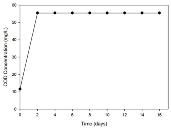 Biologically active batch reactors showed similar increase in COD concentration in the first two days, although formate spiking for the replication of bioavailable nutrient conditions was only started on day 2. The increase in the first two days was consistent in all bioreactors and in the control reactor, which confirmed that the observed increase was due to the trace amount of soluble organics in tap water and the formate dissolving from dried biogranules (Figure 8 and Figure 9).