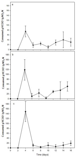 Figure 10 shows the changes in g HCOO−/g NO3-N consumption ratios throughout the experiment. The consumed g HCOO−/g NO3-N ratios were changing between 75 to 150 between days 2 and 4 that germination of spores occurred at initial DO concentration of 7.0 mg/L. In the other days, g HCOO−/g NO3-N consumption ratio was between 3.3 and 44. In batches C and D, significant amounts of NO2-N accumulated between days 4 and 10 (Figure 7c,d) which was an indication of partial nitrate reduction (Equation (5)). Indeed, the g HCOO−/g NO3-N consumption ratio was also mostly below 20 during this period. However, after day 10, NO2-N started to be consumed together with NO3-N due to the decrease in nitrate supply of the batches (replicating decreasing nitrate leaching rates of the mortars), thus the ratio of consumed g HCOO/g NO3-N started to increase towards the end of the experimental period. This rising pattern in g HCOO−/g NO3-N consumption ratio was more obvious in batch C and D as the accumulated NO2-N concentrations were higher in these two batches (Figure 7c,d). The average nutrient consumption ratios were 25.9 g HCOO−/g NO3-N, 24.9 g HCOO−/g NO3-N and 10.4 g HCOO−/g NO3-N between days 6 and 16, in batch B, C and D, respectively.