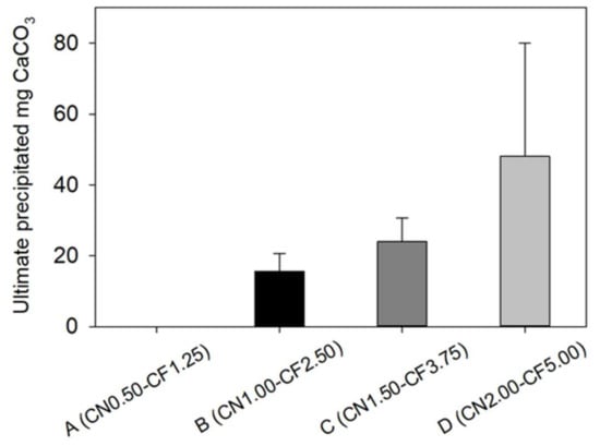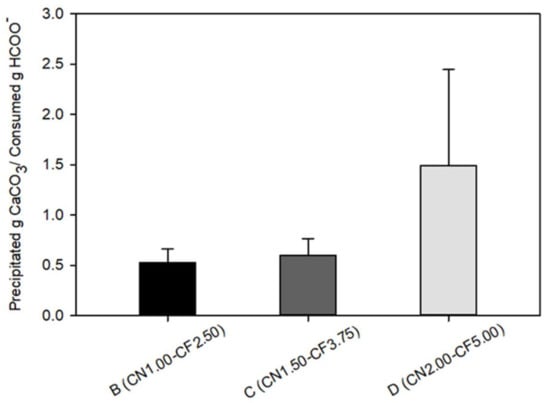 At the end of 16 days, CaCO3 precipitation yields in Batch B (replication of CN1.00-CF2.50 mortar), Batch C (replication of CN1.50-CF3.75 mortar) and Batch D (replication of CN2.00-CF5.00 mortar) were found as 0.55 ± 0.15 g CaCO3/g HCOO−, 0.60 ± 0.15 g CaCO3/g HCOO− and 1.50 ± 0.95 g CaCO3/g HCOO−, respectively (Figure 13). If all of the bioavailable HCOO− was used in CaCO3 precipitation, the yield would be 2.20 g CaCO3/g HCOO− based on the stoichiometry (Equation (1)). Therefore, according to the results, in none of the conditions HCOO− was totally consumed for MICP. In Batch B, 24% of the total bioavailable carbon was precipitated as CaCO3 and the remaining portion might have been used for germination of spores and cell synthesis. During the time period between days 2 and 4, which was thought to be the resuscitation and germination period, 33% of the total bioavailable carbon was consumed. Considering that the MICP took place after the germination period, it can be said that 36% of the bioavailable carbon was precipitated between days 4 and 16 and the rest was used in cell synthesis. In Batch C, 27% of the total bioavailable carbon was used in CaCO3 precipitation. In the resuscitation and germination period (days 2–4), 27% of total bioavailable carbon was consumed. After the resuscitation and germination period, between days 4 and 16, it was found that 37% of the bioavailable carbon was used in the CaCO3 precipitation, and the remaining portion might have used to produce new cells. In Batch D, 68% of the total bioavailable carbon was precipitated as CaCO3. In the first four days which is considered as the resuscitation and germination period, 28% of the total bioavailable carbon was consumed. After the resuscitation and germination period, between days 4 and 16, it can be said that 93% of the bioavailable carbon was precipitated. Therefore, it appeared that cell synthesis was not significant in Batch D, between days 4 and 16 which was consistent with the findings based on g HCOO/g NO3-N consumption ratio.