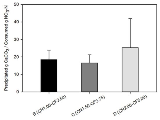 The efficient use of nutrients for MICP is essential to maximize the self-healing capacity of concrete and the efficiency can be tracked by evaluating the microbial CaCO3 precipitation yields for the provided nutrient sources. Figure 12 shows the CaCO3 yields for the electron acceptor. At the end of 16 days of experimental period, CaCO3 yields in Batch B (replication of CN1.00-CF2.50 mortar), Batch C (replication of CN1.50-CF3.75 mortar), and Batch D (replication of CN2.00-CF5.00 mortar) were found as 18.50 ± 5.35 g CaCO3/g NO3-N, 16.60 ± 4.60 g CaCO3/g NO3-N and 25.30 ± 16.65 g CaCO3/g NO3-N, respectively (Figure 12). Based on these mean values, it was concluded that the most efficient use of bioavailable NO3-N occurred in Batch D (replication of CN2.00-CF5.00 mortar). This relatively higher performance in Batch D can be attributed to the use of NO3-N mostly for MICP reactions rather than cell synthesis. As the results of g HCOO−/g NO3-N consumption ratios indicated that in Batch B and C, cell synthesis and MICP occurred simultaneously, in these batches, CaCO3 yields per reduced NO3-N became lower.