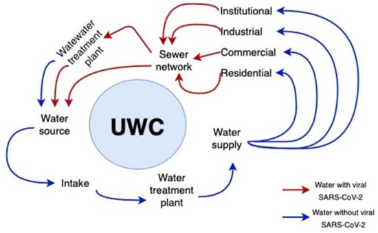 According to Peña-Guzmán et al. [], the Urban Water Cycle (UWC) is the spatio-temporal interaction between water and hydrological processes, as well as the supply, treatment, distribution, consumption, collection, and reuse that is carried out in urban or partially urban areas. Based on the interconnections and multiple processes that exist within this cycle, many authors [,,,,,,], have examined how SARS-CoV-2 can be monitoring into urban waters, mainly wastewater and affluents.