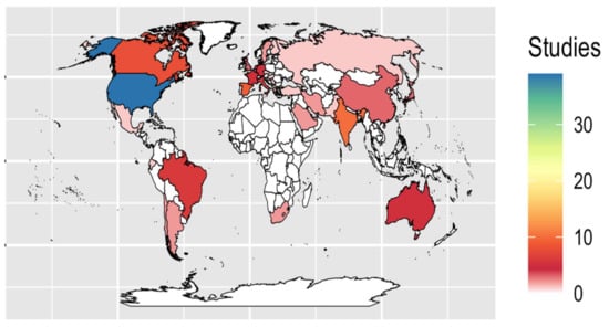 The introduction of SARS-CoV-2 into wastewater through human waste sources is a global health concern during the current pandemic. Further, our limited understanding of potential virus transmission through wastewater and the viability, persistence and inactivation of the virus using current treatment processes lead us to question the current water quality and wastewater management strategies []. This suggests the need for precautions and the strict control of faeces of infected patients with the coronavirus (mainly in hospitals). At the same time, there has been increased management, measurement and monitoring of wastewater quality related to viral presence [,]. This is because in wastewater could result in high concentrations of viral RNA in the receiving water bodies if the wastewater is not adequately treated []. Hence, to help contribute to the monitoring of the virus across the globe, academic and governmental communities (mainly in developed countries) have initiated strategies that seek to report and quantify the presence of the virus in wastewater and surface water sources. Multiple approaches have been implemented, such as risk assessments of contact with contaminated water, quantification of genetic chains, determination of SARS-CoV-2 genetic chain, detection methodologies, evaluation of treatment efficiencies and epidemiological assessment and surveillance. These approaches are being used to obtain additional information on the virus, to better understand its presence and control its transmission through wastewater [,,,,,]. According to [], viral RNA can be detected in wastewater, even when only one person in a population of 10,000 is infected with SARS-CoV-2. This emphasizes the high levels of potential for viral transmission through wastewater and the importance of the high sensitivity of current measurement methods. A total of 142 studies were found in scientific articles in 38 different countries (Table 2). This table shows the country where the study was conducted, the component of the UWC where the measurements of SARS-CoV-2 are carried out, and the specific objective of the study. The search for studies was carried out between January 2020 and June 2021 in scientific article databases.