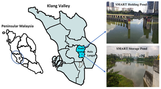 The expansion and densification of urban areas lead to an increase in impermeable surfaces, which, during rainfall events, lead to an increase in stormwater runoff volumes [1,2]. The stormwater management and road tunnel (SMART) catchment is located in Klang Valley which is one of the most densely populated and fastest urbanized catchments in Malaysia, with various industries and a high level of traffic [3,4,5]. Thus, SMART catchment is constantly exposed to the large amounts of pollutants that accumulate on various impervious surfaces from different sources such as activity-related (e.g., vehicle emissions), land cover related (buildings and infrastructure), and atmospheric deposition [6]. Stormwater ponds have been certified as one of the best management practices in urban areas that can control flooding by temporary storage of stormwater runoff, and trapping sediment and decayed plant and animal debris in runoff water, and other contaminants associated with settleable particulates [7,8]. The treatment of urban stormwater by stormwater ponds is known to be effective for both water quality improvement and storm flow management, and it has become widely implemented over the last two decades [9]. Through three mechanisms, these ponds are capable of eliminating numerous groups of contaminants such as trace metals, pesticides, polycyclic aromatic hydrocarbons, and nutrients metal pollutants. These include binding to sediments, particulates, and soluble organics or precipitation as insoluble salts, or uptake by plants and bacteria [9,10]. These ponds open up new avenues for addressing water quality and promoting infiltration via landscape-friendly technologies and multidisciplinary collaboration [11].
