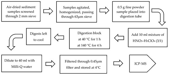 For heavy metal analysis, approximately 0.5 g of each dried sample (fraction < 63 µg) was digested with a mixture of HNO3–H3ClO4 (3/1, v/v). The sample solution was heated on a digestion block at 40 °C for 1 h and then at 140 °C for 4 h [44,45]. After cooling, the digested samples were diluted with 0.15 M HNO3 to a final volume of 40 mL and filtered through nylon syringe filters 0.45 µm and 13 mm (Figure 2). The filtered samples were then analysed using an ICP-MS Perkin Elmer ELAN DRC-e (Sciex, Mundelein, IL, USA). Following the complete analysis protocol without samples, blanks were prepared to ensure that the samples were free of contaminants.
