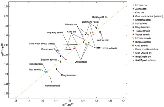 For specific source determination of Pb deposited in the SMART pond sediments, the detected isotope ratios 206Pb/207Pb and 208Pb/207Pb were compared to those of source-related materials as presented in Supplementary Material, Figure 3 and Table S3. These Pb related materials included natural sources, coal combustion, automobile exhaust (leaded and unleaded), and aerosols from regional cities in Indonesia, Vietnam, China, Thailand, India, and Australia. However, 206Pb/207Pb and 208Pb/207Pb isotope ratios in the studied sediments were closer to those of natural sources and coal combustion found in Indonesia, Australia and Shanghai, but differ from the corresponding ratios in aerosols and vehicle emissions. Malaysia imported over 22.2 million metric tonnes of coal in 2015, accounting for 99.2% of the coal supply utilized to generate electricity. The import of coal continues to rise each year, reaching 27 million metric tonnes in 2017 [78], 66.9% imports from Indonesia and 19.6% from Australia [79]. Hence, we anticipate that the majority of coals consumed in the region came from Indonesia and Australia, as Indonesian coals had Pb isotope ratios of 206Pb/207Pb = 1.184 and 208Pb/207Pb = 2.477, while Australian coals had 206Pb/207Pb = 1.206 and 208Pb/207Pb = 2.488 [80].