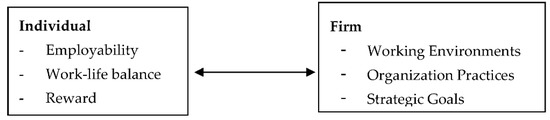 Indeed, people (human resources) are assumed to have a strategic and relevant role in organisations. Previous studies [39,46,47] have acknowledged that sustainable HRM should explore the development of a professionally trained and educated workforce. This study adopts the model in [39] to develop a new conceptual framework, which is shown in Figure 2. This paper suggests that there are two components of sustainable HRM: the firm and the individual. For the individual, the aspects of sustainable HRM include employability [48], work–life balance (WLB) [48], and reward [49]. Employability refers to the career planning and development of employees in the organisation. Rewards encompass incentives and compensation implemented for employee motivation. Work–life balance considers the employee and their social wellbeing. From the perspective of companies, sustainable HRM consists of a few elements, such as working environment [50], organisation practices [51], and strategic goals [52].