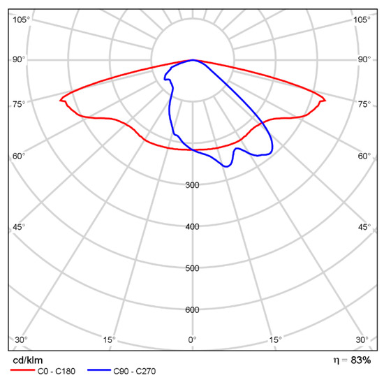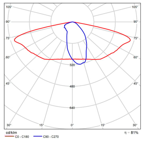 In the case of narrower roads, achieving the required design parameters required less powerful luminaires. Therefore, for the last two-lane lighting arrangement, the luminaire used was SCHREDER TECEO GEN 2 1/5244/ 24LEDs 500 mA NW 740 37.6 W/445172 [18], with the distribution curve presented in Figure 6.