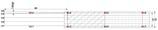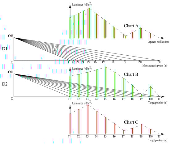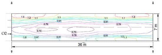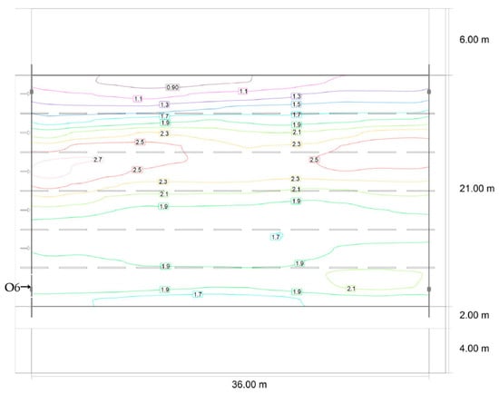 Using Equation (1), the luminance values have been calculated for the observer positions O1, O2, and O3, represented in Figure 12, considering the three types of lighting arrangements opposite, staggered, and single sided, for a 0°, 10°, and 20° tilt.