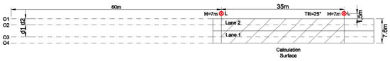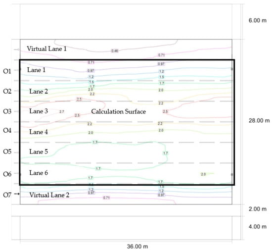 Observers 1 to 6 (O1-O6), are positioned on the center of each lane in Figure 2, from top to bottom, while observer 7 is placed outside the carriageway on the virtual lane, as presented in Figure 3, which is the worst-case scenario for average luminance values.