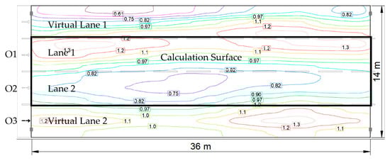 As expected, due to the usage of the luminaire and asphalt, the results were not exactly the same, but the question is: How much this influences the correction factor? By applying Equation (12) to the value measured from the O1 position, based on the DIALux Evo-calculated average luminance, one can calculate the measured value when the digital camera is positioned in the center of lane 2.