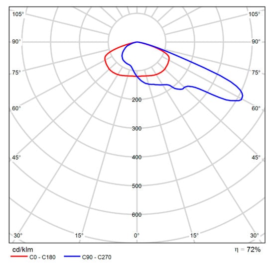 Figure 1 presents the distribution curve of the luminaire SCHREDER TECEO GEN 2 2/5248/ 72 LEDs 500 mA NW 740 109 W/457072 [18], which was used in the first set of calculations, for the street lighting arrangement presented in Figure 2. The other calculation parameters are: the height of the luminaire, which is 12.5 m, the distance from the center of the carriageway to the luminaire, that is 9 m, and the asphalt type. The most critical error that can be committed when using a design software compared to the real case is the bad approximation of the asphalt reflection factor. The reduced luminance coefficient cannot be approximated without field measurements. In order to mitigate this problem as much as possible, the lighting calculations were made for all four standard types of asphalt: Portland cement concrete (R1), asphalt with a minimum of 60% gravel (R2), asphalt with dark aggregate (R3) and asphalt with a very smooth texture (R4). The maintenance factor, for all the case studies in this paper, was set to 1.