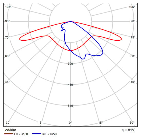 To test whether the average luminance for different observer positions is dependent on the distribution curve, the calculations have been repeated for the two-lanes carriageway (the worst case scenario) using two more luminaires, characterized by very different distribution curves, namely TECEO GEN2 1/5119/24 LEDs 500 mA NW 740 37.6 W/Back light/444962 [18], with the distribution curve represented in Figure 7, and TECEO GEN2 1/5249/24 LEDs 500 mA NW 740 37.6 W/445222 [18], with the distribution curve represented in Figure 8.