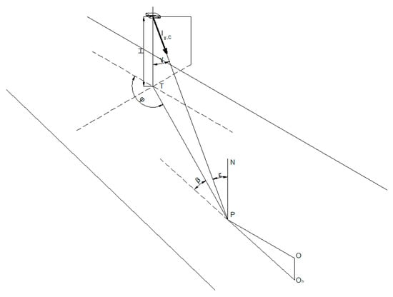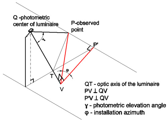 In Figure 9, Q is the luminaire position, P is the calculation point, and QT the optical axis of the luminaire. If QT is perpendicular on the plan passing through PP′, and their intersection is the point V, then PV and P′V are perpendicular on the optical axis and form the angle φ. Angle C is determined based on angle φ. The value is translated in the quadrant, in which the calculation point is in reference to the luminaire. Because PP′V is a right triangle in P′, φ can be calculated with the formula: