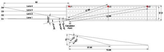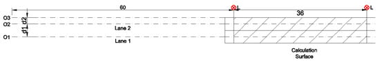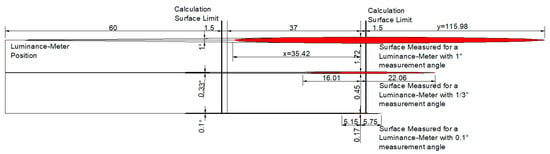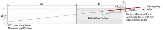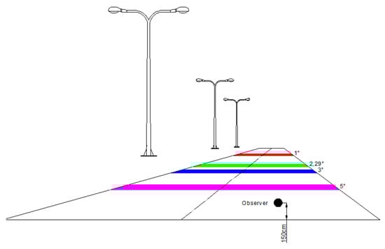 There are some studies that have evaluated the average luminance with the observer at different distances. The influence of the angle of observation on the lighting criteria has been approached in [11]. The geometry associated with the study done in [11] is presented in Figure 21. Several problems can be identified. Firstly, the calculation surface is too narrow and the values are different due to the distance to the closest pole. Therefore, the average luminance calculation must be done for a full opening between two poles, similar to the specialized software calculations. Secondly (and most importantly), the study keeps the observer in a fixed position and evaluates average luminance for different surfaces at different angles of observation.