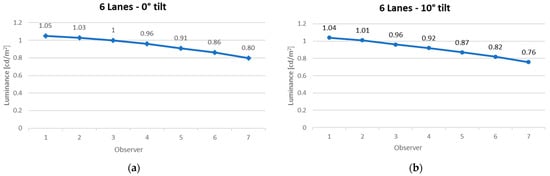 The numeric results confirm that, for symmetric arrangements, the average luminance value does not change considerably regardless of the observer’s transverse positioning. Outside the carriageway, the average luminance measurements should be done with the digital camera placed at the edge of the carriageway, as these results present minimum errors.