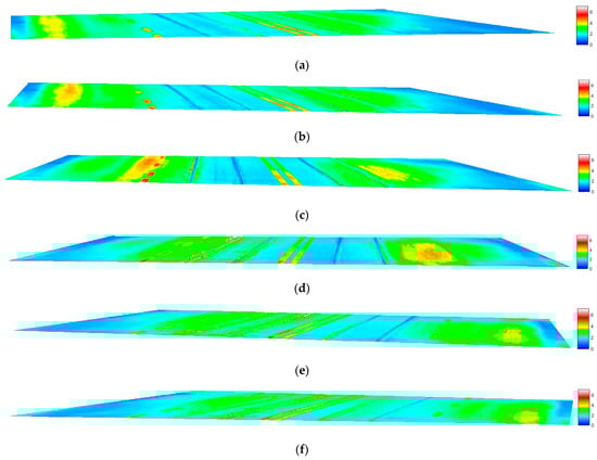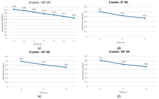 Luminance map for observer 1—observer 6 position as per Figure 23: (a) Luminance map for observer 1—left border axis; (b) Luminance map for observer 2—axis of lane 1; (c) Luminance map for observer 3—axis of lane 2; (d) Luminance map for observer 4—axis of lane 3; (e) Luminance map for observer 5—axis of lane 4; (f) Luminance map for observer 6—right border axis.