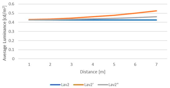 Table 4 presents a centralization of the average luminance results for the last considered luminaires and with the observers positioned according to Figure 4 and Figure 5. In the case of the symmetric lighting arrangements, for the observer placed at 1.75 m from the edge of the last traffic lane, the maximum error was the same (2%) and was, as expected, less for the observer placed at the edge of the last traffic lane. In conclusion, regardless of the distribution curve of the luminaires, in the case of the symmetrical arrangement, the average luminance can be measured with sufficient accuracy by placing the equipment near the last traffic lane.