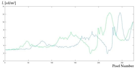 These types of determinations, in which the choice of points between which the longitudinal luminance is extracted and calculated, have a certain degree of subjectivity, but after repeated determinations, it was found that the differences remain negligible between successive calculations. As the overall calculation of the average values is much faster and more comprehensive, its usefulness is confirmed. The only precautionary measure is necessary in the case of lighting systems with a high degree of non-uniformity, where the correction of the imaging sensor for the constant incremental step, according to Figure 17, is necessary.