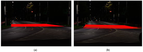 Luminance images taken with the DSLR Camera for the same calculation surface highlighted in red, from different observer positioning: (a) Luminance image for observer 1—left border axis; (b) Luminance image for observer 2—axis of lane 1; (c) Luminance image for observer 3—axis of lane 2; (d) Luminance image for observer 4—axis of lane 3; (e) Luminance image for observer 5—axis of lane 4; (f) Luminance image for observer 6—right border axis.