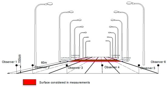 The proposed lighting arrangement that allows the placement of the observer outside the carriageway is represented in Figure 3. The average luminance was calculated in the same way for both observer positions, using the mean values obtained for the center of the six traffic lanes. In Figure 3, the areas considered for the average luminance calculation have been highlighted.