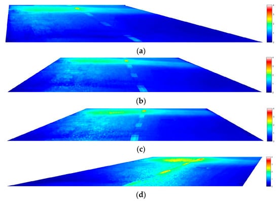 Luminance map for observer 1—observer 4 position as per Figure 26 installation geometry: (a) Luminance map for observer 1—left border axis; (b) Luminance map for observer 2—axis of lane 1; (c) Luminance map for observer 3—axis of lane 2; (d) Luminance map for observer 4—right border axis.