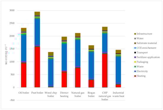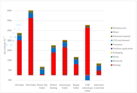 Similar to greenhouse tomato production, the GWP of greenhouse cucumber production is the lowest when using biofuels or industrial waste heat as the heating method, as shown in Figure 4. Due to higher lighting demand, the production of cucumbers requires more electric than heat energy. Due to the lower heat demand, differences in GWP among the different heating scenarios are not as remarkable as those for tomato production. Even though greenhouse cucumber production requires almost as much total energy as that for greenhouse tomato production, its production is less emission intensive than tomato production. This is due to the lower emissions of the Finnish grid electricity compared to the emissions of most heating methods. In total, the GWP of the Finnish greenhouse cucumber production varied between 1379 and 2951 kg CO2-eq. FU−1. Similar to tomato production, the largest GWP, 2951 kg CO2-eq. FU−1, was obtained when using a peat boiler, which was followed by the oil and natural gas boilers, with GWPs of 2323 and 2110 kg CO2-eq. FU−1, respectively. The lowest GWP, 1379 kg CO2-eq. FU−1, resulted from the use of a wood chip boiler, followed by industrial waste heat and the biogas boiler, with GWPs of 1466 and 1634 kg CO2-eq. FU−1, respectively. The use of the Finnish district heating resulted in a fairly average GWP of 1979 kg CO2-eq. FU−1. Applying the CHP boiler to cover the energy needs of the greenhouse cucumber production resulted in a GWP of 2351 kg CO2-eq. FU−1.