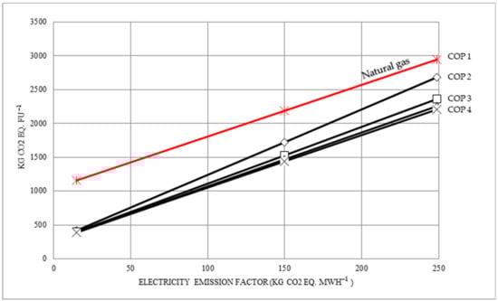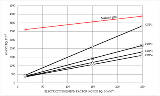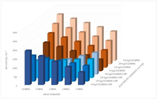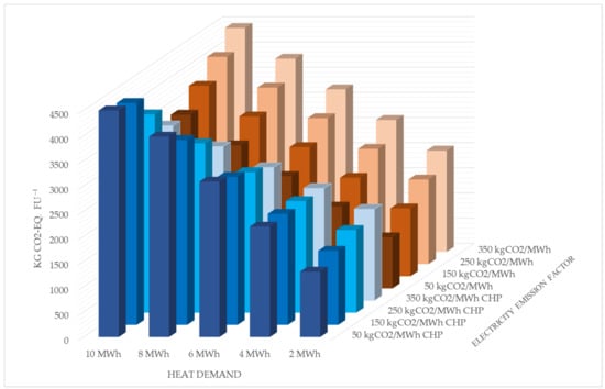 The results indicate that for electricity emission factors of 50 and 150 kg CO2-eq. MWh−1, the use of the conventional natural gas boiler resulted in lower GWP than that of the natural gas CHP boiler. For electricity emission factors of 250 and 350 kg CO2-eq. MWh−1, the use of the natural gas CHP boiler resulted in lower GWP compared to that of the conventional natural gas boiler, even though no remarkable benefits were recorded. An analysis of the results suggests that regardless of the heat demand, using the conventional natural gas boiler results in lower total GWP than using the natural gas CHP boiler when the electricity emission factor of the local grid electricity is under 228.3 kg CO2-eq. MWh−1. Conversely, the natural gas CHP boiler results in a lower GWP when the grid’s electricity emission factor is above this threshold value.