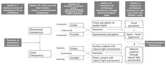 Therefore, at this point when it is essential to redefine the relationship between the inside and the outside, the discussion of architectural transparency beyond the visual perception of surfaces must be examined. Moreover, it is an important time to reconsider a new architectural methodology apart from the most influential “literal/phenomenal transparency” through the phenomenological idea. This study revisits Colin Rowe and Robert Slutzky’s “literal/phenomenal transparency” and investigates its limit [23]. Then, it examines the concept of depth in Merleau-Ponty’s phenomenology, which goes beyond visual perception and reproduces a new spatial cognition.